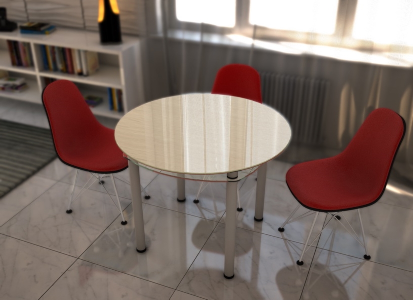 Стеклянный стол с круглой столешницей. Кроме столешницы, в конструкцию стола входит и стеклянная полка.